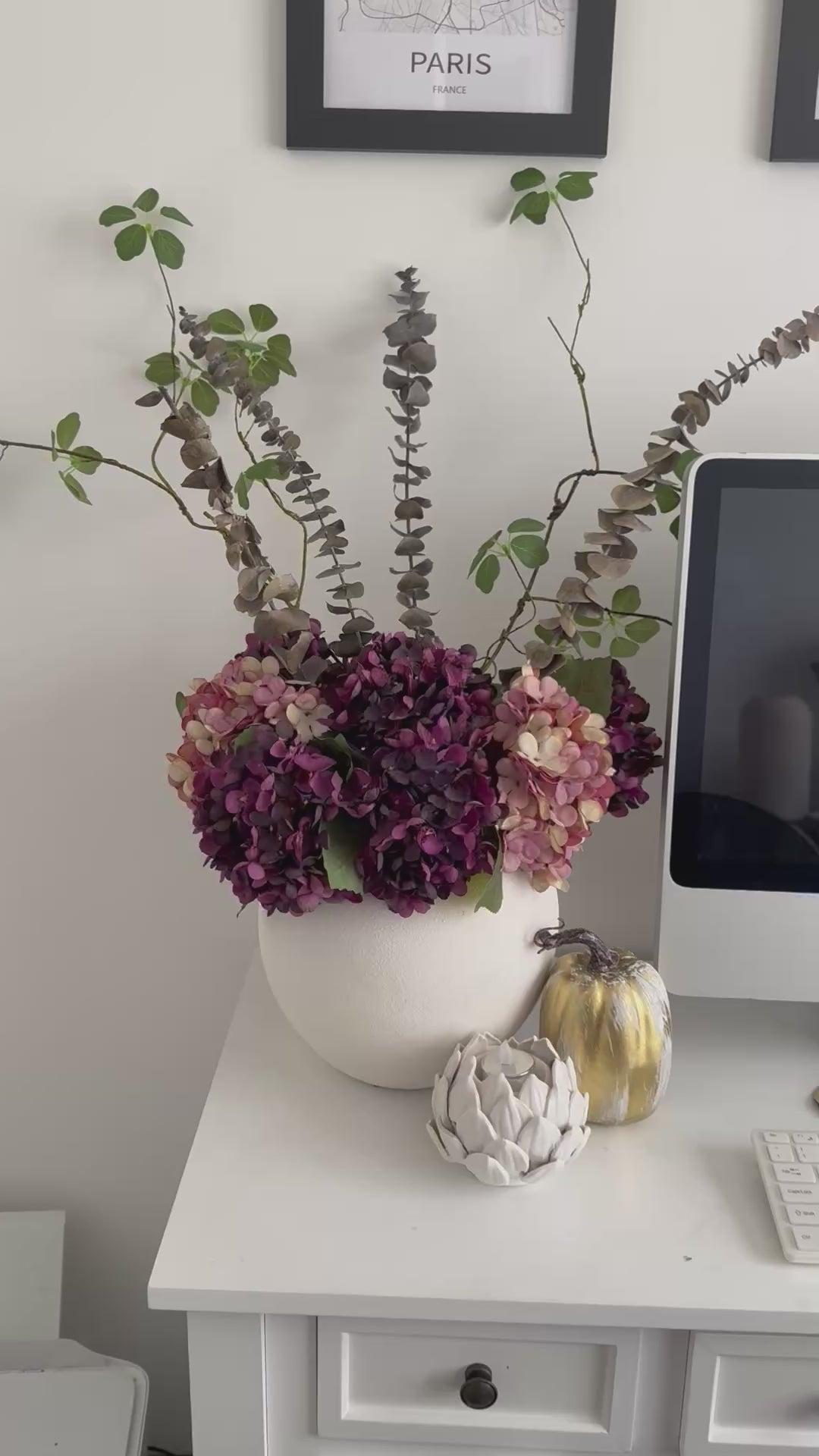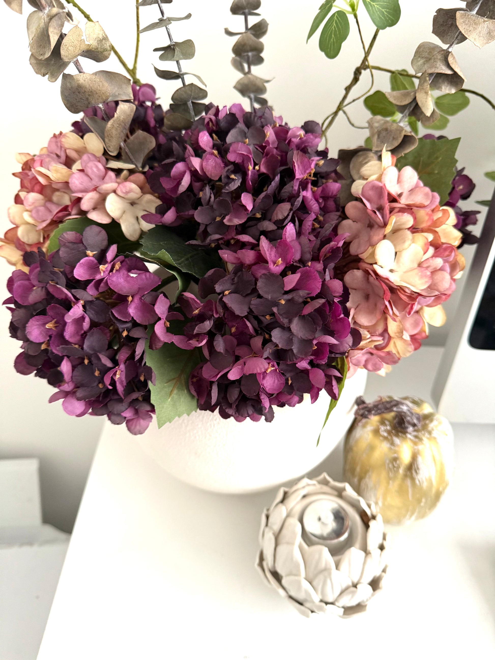 Add a bit warm to your room with these Aubergine Colour Artificial Hydrangeas.