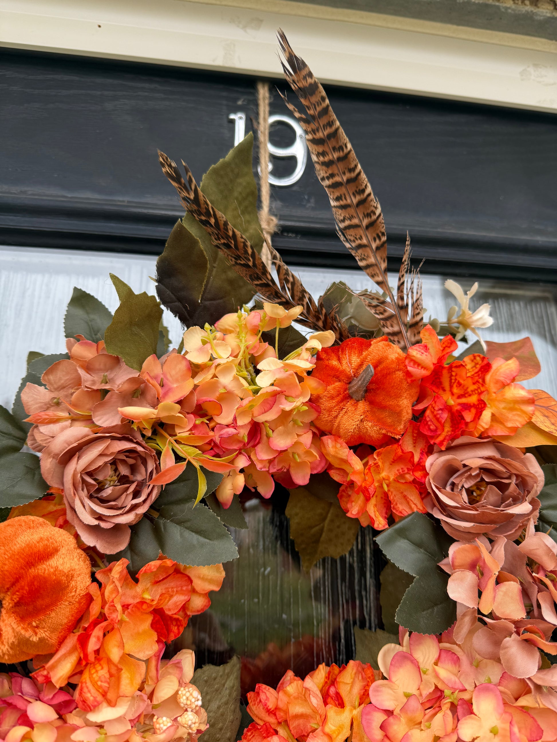 Decorated with soft Velvet Small Pumpins,Hydrangeas ,Roses and Pheasant Feathers .