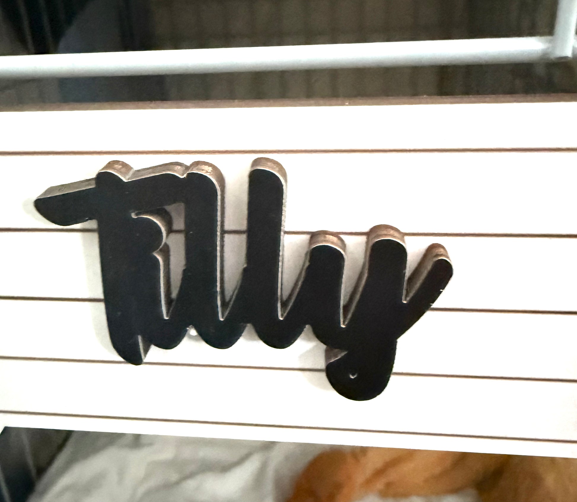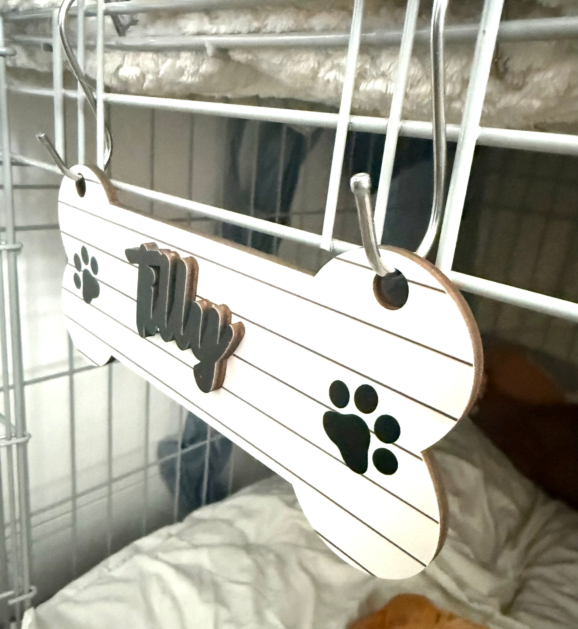 Can be attached to a Dog Crate or any other item as the silver hooks are included with the sign.